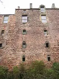 The castle was rebuilt in the late 16th century. A new five-storey east range was built into the side of the rock, and the gatehouse was rebuilt, this time with a permanent stone bridge. In 1591 the Laird of Roslin was forfeited, and the castle was held by William Leslie for the Earl of Huntly. The rebel Earl of Bothwell stayed, and left in a hurry leaving his coffers with clothes and silver plate behind.[6]