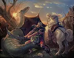 At midnight a monstrous serpentine dragon emerges from the forest; Rakhsh approaches his sleeping master and neighs and beats the ground so furiously, that he succeeds in waking him. Rostam looks around, but, seeing nothing, because the dragon has already vanished, grumbles and goes back to sleep. The dragon appears a second time and once again the faithful horse succeeds in rousing his master. Rostam is even angrier than before; but at this moment sufficient light is providentially given him to allow him to see the monster that has been causing Rakhsh such alarm. Rostam then slays the dragon.