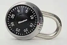 An externally-accessible dial is manipulated to release the shackle of a padlock or a lock bolt securing a door. The dial is connected to an internal mechanism, usually containing three separate wheels with notches, called gates. Each wheel must be aligned to allow a fence to drop into the gates, releasing the lever that holds the lock in place, allowing the lock to open. Generally, this is accomplished by moving the dial to three (or more) positions, usually denoted by numbers, in a specific sequence of alternating clockwise and anti-clockwise turns.[1]: 2