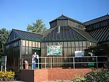 Canal Gardens, separated by Street Lane from the main area of the park, contains Tropical World, a series of temperature-controlled glasshouses representing different climates from around the world. It holds the largest collection of tropical plants in the UK after Kew Gardens. The main building, Coronation House, is named from the original 1911 building, the year of the coronation of George V. The present construction was built in 1939 and modernised in 1983, re-opening as Tropical World.[2] In July 2008 it was renamed The Arnold and Marjorie Ziff Tropical World. Arnold Ziff gave £30,000 towards its launch.[10]