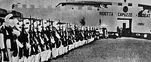 In one hundred and fifty battles gloriously sustained in the service of His Majesty the King of Italy, gave constant evidence of strong heroic military discipline, of fierce warrior spirit, of unquestioned loyalty and value, lavishing their blood with a zeal and devotion than never had limitations. Eritrea - Tripoli - Cyrenaica, from 1889 to 1929. - May 12, 1930[30]