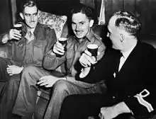Lieutenant D. M. N. Davidson (right) of the RNVR enjoying beer with members of Z Special Unit in Brisbane after the completion of Operation Jaywick