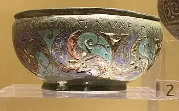 The cup is 46mm high, with a rim diameter of 89-93mm (once circular, now a little squashed). The base, now missing, is 58mm in diameter. The Champlevé enamelling is in three zones: a lower zone consisting of a grid of rectangles; a central zone consisting of fourteen alternating rectangles (these being subdivided into four smaller rectangles with crenellations along the top), alternating with a leaf-shaped design; a third, narrow, grooved channel at the top containing the lettering given below.[1]