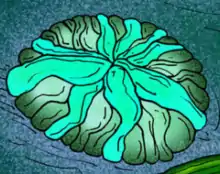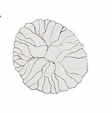 Rugoconites is a genus of Ediacaran biota found as fossils in the form of a circular or oval-like impression preserved in high relief, six or more centimeters in diameter. The fossils are surrounded by frills that have been interpreted (Wade 1972) as sets of tentacles. The bifurcating radial ribs, spreading from a central dome, serve to distinguish this genus from the sponge Palaeophragmodictya, and may represent the channels of the gastrovascular system.[1] Fossils of Rugoconites have been interpreted as early sponges,[2] although this is countered by Sepkoski et al. (2002), who interpreted the organism as a free-swimming jellyfish-like cnidarian; similar to Ovatoscutum.[3] However, the fossil is consistently preserved as a neat circular form and its general morphology does not vary, therefore a benthic and perhaps slow-moving or sessile lifestyle is more likely. Ivantstov & Fedonkin (2002), suggest that Rugoconites may possess tri-radial symmetry and be a member of the Trilobozoa.[4]