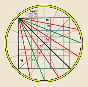 The compass rose in the center can be overlooked – indeed, the circle itself can be ignored, as it seems to have no other purpose than the construction of the rays that run across the grid.[27] The rose of interest is in the upper left corner of the square grid. From that corner, emanate a series of compass rhumb lines. In his original 1436 tondo e quadro, Bianco has sixteen emanating rays – that is, Bianco includes half-quarter winds, or eighth-winds (otava), so that the emanating rays are at intervals of 5.625 degrees. Other constructions of the circle-and-square, e.g. the Cornaro Atlas, use only eight rays emanating at quarter-wind distances (11.25 degrees). Visually, these rays replicate the bottom right quarter of a 32-wind compass rose: East (0q), E by S (1q), ESE (2q), SE by E (3q), SE (4q), SE by S (5q), SSE (6q), S by E (7q) and South (8q).