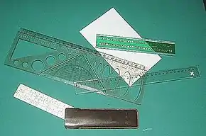 A ruler, sometimes called a rule, line gauge, or scale, is an instrument used to make distance measurements whereby a user estimates a distance by reading from a series of markings called "rules" along an edge of the device.[1] Commonly the instrument is rigid and the edge itself is a straightedge ("ruled straightedge") which additionally allows one to draw straight lines. Some rulers such as cloth or paper tape measures are non-rigid. Specialty rulers exist that have flexible edges that retain a chosen shape and these find use in sewing, arts, and crafts.