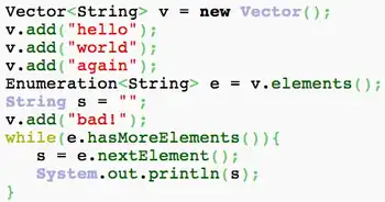 The Vector class in Java has two means for iterating over its elements. One may use the Iterator interface, as seen in the previous example, or one may use the Enumeration interface. Besides the addition of a remove method for the Iterator interface, the main difference is that Iterator is "fail fast" while Enumeration is not. What this means is that if one modifies the Vector (other than by using the Iterator remove method) when one is iterating over the Vector using an Iterator, a ConcurrentModificationException is thrown. However, when using an Enumeration this is not a case, as mentioned. This can result in non-deterministic results from a program because the Vector is left in an inconsistent state from the perspective of the Enumeration. For legacy programs that still use the Enumeration interface, one may wish to enforce that Enumerations are not used when their underlying Vector is modified. The following parametric regular pattern can be used to enforce this behavior: