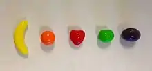 - In 2009, green apple and grape were added to the mix. Pineapple and mango were removed. Green apple reused the cherry shape, and grape reused the mango shape.