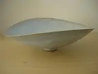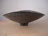In 1996, he set up his own pottery at Church Farm in Shropshire where his style changed from a functional to a more minimalist, finer, more complex style ranging in size from miniature to large-scale. While he continues to make and sell functional pottery he is now known for this more recent studio pottery. His best and most recognizable work contains poems, both self-written and by Kathleen Raine the celebrated British poet. The poems are either scratched into the glaze in the sgraffito style or written as embossed letters either in a square block or in a single line across the surface of the vessel.[5] These works vary in size from small prayer bowls only a few centimetres across through to huge, open bowls 50 cm or more in diameter. He is also known for his cylinders which are often made as part of a series and while each stands alone, are meant to be exhibited as a group. These also vary in scale from a few centimetres high through to the largest being a meter or more tall. He works in a limited palette, mainly simple white, off-white and black monochromes but he does also occasionally make deep, red-glazed bowls and bright yellow tea sets.[6]