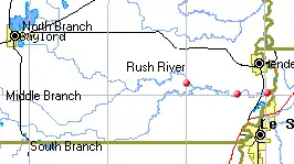 The North Branch Rush River drains from Titlow Lake east of Gaylord, Minnesota, and flows 11.3 miles (18.2 km) southeast,[1] joining the Middle Branch Rush River to form the Rush River.