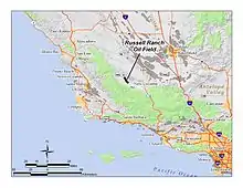 ![]() The Russell Ranch Oil Field in central and southern California. Other oil fields are shown in dark gray. | |