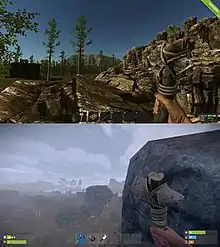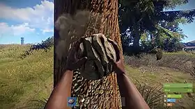 As a multiplayer-only video game,[1] Rust pits players against each other in a harsh, open world environment with the sole goal of survival. Animals, such as wolves and bears, act as a looming threat, but the primary danger comes from other players.[1] Most maps are procedurally generated,[2] with the exception of some pre-built maps.[3] When beginning, a player only has a rock and a torch. The rock can cut down trees, break apart stones, and be used as a weapon. Cloth and food can be gathered by killing animals; mining provides stone, metal ore, and sulfur ore; and chopping down trees provides wood.[4] To survive in the world, the player must gather resources and use them to craft tools, weapons, and other gear.[5][6] To craft items, the player must have a sufficient amount of all required materials,[7] with advanced items needing more obscure components scattered around the map.[8] There are limitations imposed on the amount of craftable items, with blueprints allowing the creation of more advanced items.[7]