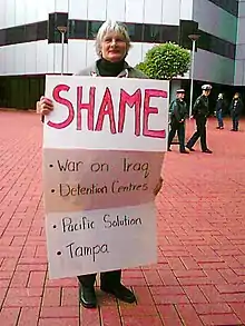 Ruth Elizabeth Russell (born 6 March 1946) is an Australian peace activist, and one of five Australian citizens who travelled to Iraq in 2003 to function as a human shield, and for some of the eight weeks was located at the Taji food silo. Her stated reason for doing so was to show "solidarity with the Iraqi civilians who will suffer greatly from the planned invasion of Iraq".[1][2]