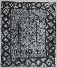 Before the rya rug in Sweden, peasants would sleep between fur skins, but the skins could become stiff and the fur could not be washed.[3] The peasants then used wool plucked directly from the sheep without spinning to simulate fur as close as possible.[3] They used the natural colors of the wool, which were black, white, and grey, to make simple patterns in the high pile.[3] During the weaving, the wool was knotted in.[3] The pile side of the rya had a soft sheen that resembled fur and was placed facing the body just like the fur skins were used previously.[3] The pattern of the flat surface of other side was given less attention, and was the part on which the owner worked in their initials into the striped geometric design.[3] Later, the wool was put into hot water before being used, which shrunk, stiffened, and tightened the wool.[3] Consequently, the rugs were more durable, but were not as soft and glossy as earlier rya rugs.[3]