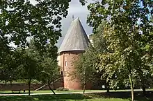 The Griffin dukes lost the area to the Samborides during the following years, and the next surviving documents mentioning the area concern donations made by Samboride Swietopelk II, dating to 1236 (two documents) and 1240.[10] In the earlier of the two 1236 documents, a Johann "castellanus de Slupcz" is mentioned as a witness,[11] Schmidt considers this to be the earliest mention of the gard, since a castellany required the existence of a gard.[12] The first surviving record explicitly mentioning the gard is from 1269: it notes a "Christianus, castellanus in castro Stolpis, et Hermannus, capellanus in civitate ante castrum predictum", thus confirming the existence of a fortress ("castrum") with a suburbium ("civitas").[12] Schmidt further says that the office of a capellanus required a church, which he identifies as Saint Peter's.[12] This church is mentioned by name for the first time in a 1281 document of Samboride Mestwin II, which also mentions Saint Nicolai church and a Saint Mary's chapel in the fortress.[13] The oldest mention of Saint Nicolai church dates to 1276.[13]