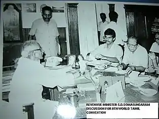 Somasundaram was in charge of conducting the 8th Tamil World Conference at Thanjavur during his tenure as the revenue minister. Subsequently, due to a difference of opinion with J. Jayalalithaa, he quit AIADMK again and floated another party called "Puratchi Thalaivar AIADMK."