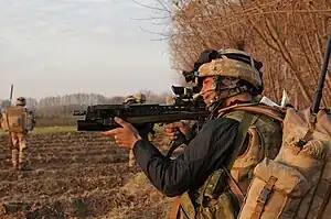 More recently, weapons used by some Royal Marines, Infantry, RAF Regiment, Ministry of Defence Police and soldiers with a dismounted close combat role in operations in Afghanistan have had the SUSAT replaced with the Trijicon Advanced Combat Optical Gunsight (ACOG).[16] In 2011, the Ministry of Defence began issuing ELCAN SpecterOS 4× Lightweight Day Sights (LDS) in an effort to replace ageing SUSAT units across the British Armed Forces, forming the first stage of the FIST infantry enhancement project.[50] In order to mount the new sight, the weapon has been provided with an adapter to convert the existing sight rail to the Picatinny standard, in keeping with the updated handguard. The FIST project has also seen upgrades to the existing Qioptiq CWS (4×) and Maxi-Kite (6×) night vision scopes, and the introduction of the FIST Thermal Sight, following operational experience with the VIPIR-2+ thermal weapon sight in Afghanistan. All of the new FIST weapon sights have the capacity to accept Shield's Close Quarter Battlesight reflex sight.[51]