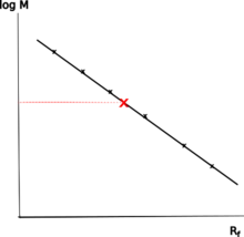 For a more accurate determination of the molecular weight, the relative migration distances of the individual protein bands are measured in the separating gel.[36][37] The measurements are usually performed in triplicate for increased accuracy. The relative mobility (called Rf value or Rm value) is the quotient of the distance of the band of the protein and the distance of the buffer front. The distances of the bands and the buffer front are each measured from the beginning of the separation gel. The distance of the buffer front roughly corresponds to the distance of the bromophenol blue contained in the sample buffer. The relative distances of the proteins of the size marker are plotted semi-logarithmically against their known molecular weights. By comparison with the linear part of the generated graph or by a regression analysis, the molecular weight of an unknown protein can be determined by its relative mobility.[36]