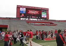 The newly expanded South End zone at Rutgers Stadium, pictured after the 2010 spring game. Note the Brown Football Recruiting Pavilion and Welcome Center located in the center of the seating area, as well as the brand new scoreboard.