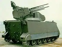 The SIDAM 25 [2] is a self-propelled anti-aircraft gun developed in Italy from the chassis of the American M113 armoured personnel carrier. Due to the choice of basic chassis for the Sidam 25, components and spare parts were both cheap, and readily available due to the widespread use of the basic M113. Beginning production in 1987, OTO Breda built a large turret to accommodate the four Oerlikon KBA cannons and remodelled the hull of the M113 slightly to provide side-access to the internal space of the vehicle by the addition of a side-mounted door.