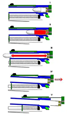 Once the case has been ejected, the slide and breechblock that it contains have now moved past the area of the magazine. A spring in the magazine pushes the next cartridge in the magazine upward as the empty case is ejected. The slide then returns forward to its battery position. As it moves, the breechblock strikes the cartridge that is at the top of the magazine and pushes it into the chamber. Once it has fully returned to its locked position, it is referred to as being "in battery". This completes the reloading cycle.