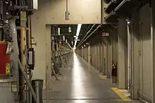 The main accelerator was an RF linear accelerator that accelerated electrons and positrons up to 50 GeV. At 3.2 km (2.0 mi) long, the accelerator was the longest linear accelerator in the world, and was claimed to be "the world's most straight object."[13] until 2017 when the European x-ray free electron laser opened. The main accelerator is buried 9 m (30 ft) below ground[14] and passes underneath Interstate Highway 280. The above-ground klystron gallery atop the beamline, was the longest building in the United States until the LIGO project's twin interferometers were completed in 1999. It is easily distinguishable from the air and is marked as a visual waypoint on aeronautical charts.[15]