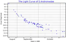 The independent detection of the supernova by Ernst Hartwig at Dorpat (Tartu) Observatory in Estonia on August 20, 1885, however, was communicated in a telegram on August 31, 1885, once Hartwig had verified in more ideal circumstances that the feature was not caused by reflected moonlight.[7][8] The telegram prompted widespread observations of the event,[9] and prompted Isaac Ward, Ludovic Gully, and several others to publish their earlier observations (the first reports on S Andromedae appeared before Hartwig's discovery letter which followed his telegram, since the letter was initially lost by Astronomische Nachrichten and only reprinted in a later issue). The history of the discovery is summarized by K.G. Jones[10] and de Vaucouleurs and Corwin.[2] Both studies doubt that Ward really saw the event since his estimated magnitude is significantly off from the later reconstructed light curve,[2] and conclude that Hartwig should be considered as the discoverer of the supernova.