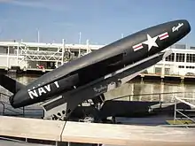 The SSM-N-8A Regulus or the Regulus I was a United States Navy-developed ship-and-submarine-launched, nuclear-capable turbojet-powered second generation cruise missile, deployed from 1955 to 1964. Its development was an outgrowth of U.S. Navy tests conducted with the German V-1 missile at Naval Air Station Point Mugu in California.[1] Its barrel-shaped fuselage resembled that of numerous fighter aircraft designs of the era, but without a cockpit. Test articles of the Regulus were equipped with landing gear and could take off and land like an airplane.[2] When the missiles were deployed they were launched from a rail launcher, and equipped with a pair of Aerojet JATO bottles on the aft end of the fuselage.