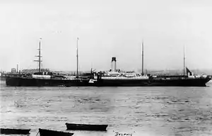 SS Delphic was an ocean liner of the White Star Line, built by Harland and Wolff in Belfast and completed on 15 May 1897.[1] She worked the New Zealand trade. She was a fairly slow ship primarily intended for transporting emigrants and goods to New Zealand. Despite this, she made her first crossings on the New York route before joining the route to New Zealand. For twenty years, her service on this route was uneventful, with the exception of troop transport missions during the Second Boer War.