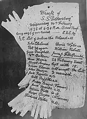 By the morning of 25 February, only the masts were visibly protruding from the water, with 14 people clinging to the rigging, where they remained for the next twenty-four hours in cyclonic weather.[18] At low tide, Gothenburg sank stern first and the wreck fell apart. However, the remaining starboard lifeboat, which had capsized, was still held by her painter and the rope attached by Cleland. At first light on 26 February the weather eased and the survivors managed to right the boat and bail it out; they prepared a makeshift sail and paddled for the mainland. About seven hours later they realised they could not make the mainland, so they altered course for an island that could be seen in the distance. When they arrived, they were met by four of the crew from one of the port lifeboats. Their lifeboat had been severely damaged on the rocks on the opposite side of the island in an attempt to land there the day before.[20]