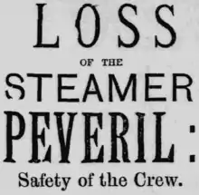 On Wednesday 14 December 1887, the body of a woman was discovered between the casing and the boiler of the Peveril's port side. It was believed that the woman secreted herself in the narrow passage for warmth and consequently suffocated.[3]