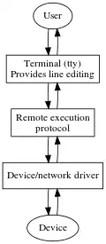 In Version 7 Unix, a command was connected to a terminal (keyboard and screen, or keyboard and printer) through a mechanism called the line discipline, which would buffer a single line of input, i.e., wait for the user to press the Return key before sending input to the program for processing; this allowed simple error correction. Streams replaced this with a set of processing modules organized in a linear chain that allowed bidirectional communication between neighboring modules. Programs could "push" a new module onto one end of the chain to change the behavior of a terminal or other character device. Ritchie gives the example chain of a terminal module chained with a Datakit network module to achieve remote login over a network.[5] Aside from characters (bytes) going from program to device and vice versa, Streams could carry control messages such as "hangup" (drop connection) and ioctl messages.