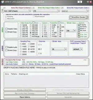 Back-end program features supported by SUPER include saving various streaming protocols (mms, rtsp, and http), conversion of Flash Video to other formats, and user-controlled conversion of video between different container formats. Users can choose between various lossless direct audio/video transfers between container formats or lossy video/audio encoding, with encoding possessing the added ability to change video and audio specifications such as bitrate, frame rate, audio channels, resolution, sampling rate, and aspect ratio. SUPER is also able to utilize its back-end's built-in media players, allowing playback of supported video and audio formats.