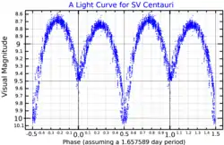 The orbital period of SV Centauri is monotonically decreasing at a very fast mean rate of 2.1 seconds per year, the largest rate for any known system. The first observations of the system, in 1894, revealed a period of 1.6606 days, which decreased to 1.6581 days in 1993,[7] showing a decrease rate that is variable with time, but with time intervals of 10 to 30 years when it is constant. The transition between such intervals of constant change can be accompanied by very fast decreases in the period, such as of 15 seconds per year in 1975.[8]