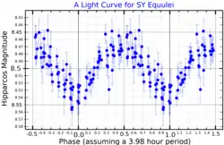 SY Equueli is a variable star with an amplitude of 0.07 magnitudes[6] and an average period of 3.98 hours.[19] In later observations, SY Equulei was found to have multiple periods.[12]