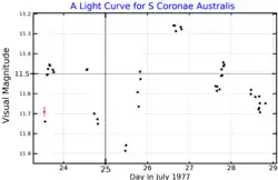 ![]() A visual band light curve for S Coronae Australis, adapted from Mundt (1979).[1] The error bar shown on the left-most point applies to all points. | |