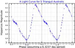 S Trianguli Australis is a yellow-white hued variable star in the constellation Triangulum Australe. It is a dim star near the lower limit of visibility with the naked eye, having a typical apparent visual magnitude of 6.41.[3] Based upon an annual parallax shift of 1.08 mas,[2] it is located 3,030 light years from the Earth.