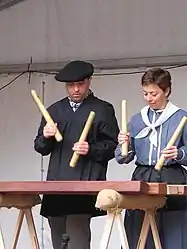 A musical tradition closely related to cider production is the instrument called txalaparta. The boards employed in the cider press were used as a percussion instrument by striking on them with cylindrical sticks after the cider making had finished to summon the neighbours to a celebration and to drink cider.[7] A related but less known variant of the txalaparta is the kirikoketa.