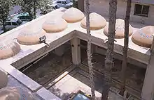 Small sahn (courtyard) of a mosque in Tehran, with a howz (fountain pool) and domed riwaq.