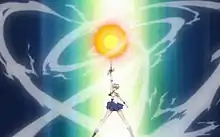 Sailor Uranus' powers are inspired by Greek mythology, where Uranus is the god of the sky. They are also inspired by Western astrology, where the planet Uranus is associated with natural disasters, such as "earthquakes, tornadoes, typhoons and hurricanes."[16] Her first attack is World Shaking;[17] she gathers energy from the sky and sends it toward to her foes by smashing the energy against the ground. She is given three major attacks in the series, and although they all have English names (like those of the other Sailor Soldiers), each is also given kanji in the manga to denote the meaning to Japanese readers. For example, World Shaking is given kanji which translate to "sky" (天), "world" (界), and "shake" (震).[10] The intended English pronunciation is given in furigana. This is Sailor Uranus's primary attack for most of the anime series.