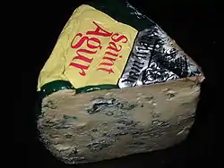 Saint Agur (pronounced [sɛ̃taɡyʁ]) is a blue cheese made with pasteurised cow's milk from the village of Beauzac in the Monts du Velay, part of the mountainous Auvergne region of central France. Developed in 1988 by the cheese company Bongrain, it is made from pasteurised cow's milk, enriched with cream, and contains 60% butterfat, qualifying it as a double-cream cheese. Aged for 60 days in cellars, the cheese becomes stronger and spicier as it ages.