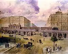 The question of building an underground road in Saint Petersburg arose in 1820. A resident of the city, a self-taught man by the name of Torgovanov, submitted a bold project to Tsar Alexander I — involving the digging of a tunnel from the center of the city to Vasilyevsky Island. The Russian ruler rejected the project and ordered the inventor to sign a pledge "not to engage in hare-brained schemes in the future, but to exercise his efforts in matters appropriate to his estate."[2] Other, more developed projects subsequently emerged, but they, too, received no recognition.