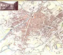 Salford began to emerge as a small town early in the 13th century. In 1228, Henry III granted the caput of Salford the right to hold a market and an annual fair. The fairs were important to the town; a 17th-century order forced each burgess – a freeman of the borough – to attend, but the fairs were abolished during the 19th century.[26] The Earls of Chester aided the development of the caput, and in 1230 Ranulf de Blondeville, 6th Earl of Chester made Salford a burgage, or free borough.[22][27] The charter gave its burgesses certain commercial rights, privileges and advantages over traders living outside Salford; one of the 26 clauses of the charter stated that no one could work in the Hundred of Salford unless they also lived in the borough.[4][14][26] Salford's status as a burgage encouraged an influx of distinguished families, and by the Late Middle Ages Salford was "rich in its manor houses", with over 30 within a 5-mile (8 km) radius of Ordsall.[4] These included Ordsall Hall (owned by the Radclyffe family) and Broughton Hall, owned by the Earls of Derby.[4][20]