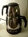 listen), literally "self-brewer") is a metal container traditionally used to heat and boil water. Although originating in Russia, the samovar is well known outside of Russia and has spread through Russian culture to other parts of Eastern Europe, as well as Western and Central and South Asia. Since the heated water is typically used to make tea, many samovars have a ring-shaped attachment (Russian: конфорка, konforka) around the chimney to hold and heat a teapot filled with tea concentrate.[1] Though traditionally heated with coal or kindling, many newer samovars use electricity to heat water in a manner similar to an electric water boiler. Antique samovars are often prized for their beautiful workmanship.