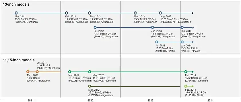 Initially, the line up included 11-inch screen-size model and 13-inch screen-size model but the 11-inch version was dropped by the end of 2011 due to the low popularity in Korean market. Instead, 15-inch model superseded 11-inch one in early 2012. The screen size was slightly increased from 15.0 inch to 15.6 inch in 2014 but the thickness remained the same at 14.9 mm (0.59 in).