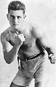 On June 26, 1922, Mosberg was knocked out a few seconds into the first round by southpaw Eddie Fitzsimmons in an important twelve-round, semi-final match before a huge crowd of 20,000 at New York's Bronx Velodrome. Fitzsimmons was an unusually powerful lightweight, with over 50% of his wins by knockout and a good record against most of the better lightweights of the 1920s. Mosberg, in an interview in 1948, claimed Fitzsimmons had hit him with his powerful left when he went to shake hands shortly after the opening bell.[1] The large crowd had come to see Benny Leonard meet welterweight champion Jack Britton in the final match but first watched the Mosberg bout. The powerful Fitzsimmons had beaten future world Junior Welterweight champion Pinky Mitchell and had fared well against the great lightweights Johnny Dundee, Pal Moran, and New York Jewish battler Lou Tendler. He had also won decisive victories over Chicagoan Jewish lightweight Charley White, New York Jewish lightweight Phil Bloom and 1920 Connecticut state welterweight champion Lou Bogash.[30][6] Mosberg felt badly about the loss and was hoping for a rematch when he was called to fight in Australia.[1]