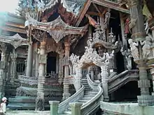 The Sanctuary of Truth (Thai: ปราสาทสัจธรรม) is an unfinished museum in Pattaya, Thailand designed by Thai businessman Lek Viriyaphan.[1] The museum structure is a hybrid of a temple and a castle that is themed on the Ayutthaya Kingdom and of Buddhist and Hindu beliefs. The building is notably constructed entirely out of wood, specifically Mai Deang, Mai Takien, Mai Panchaat, and Teak. It contains only wood-carved idols and sculptures. Construction first began in 1981 and is still in construction, though visitors are permitted inside with hard hats. Located on 13 hectares of land, the temple houses an internal space of 2,115 m2, with the tallest spire reaching to 30 m.[2]