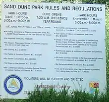 Currently, use of the sand dune portion of the park is by reservation only, which must be made in advance at City Hall, a little over a mile away during business hours. The entrance to the fenced area is supervised during scheduled hours. The city has found the restrictions to be a treasure trove of revenue, heavily fining violators of the restrictions (including non-residents who are unaware of the rigidity of the restrictions) hundreds of dollars for a single violation.