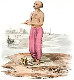 Other aspects of the ritual, though, speaking strictly, not included in Sandhyavandanam, may include meditation, chanting of other mantras (Sanskrit: japa), and devotional practices specifically for divinities that are preferred by the practitioner.[26] Regarding the connection with meditation practices, Monier-Williams notes that if regarded as an act of meditation, the sandhyā may be connected with the etymology san-dhyai.[27]