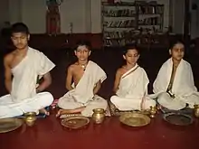 Sandhyavandanam (Sanskrit: सन्ध्यावन्दनम्, sandhyāvandanam, lit. 'salutation to (Goddess) Twilight' or 'salutation during the twilight') is a mandatory religious ritual centring around the recitation of the Gayatri mantra, traditionally supposed to be performed three times a day by Dvija communities of Hindus,[1][2] particularly those initiated through the sacred thread ceremony referred to as the Upanayanam and instructed in its execution by a Guru, in this case one qualified to teach Vedic ritual.[2] Sandhyopasana is considered as a path to attain salvation (moksha).